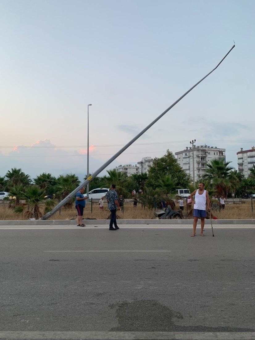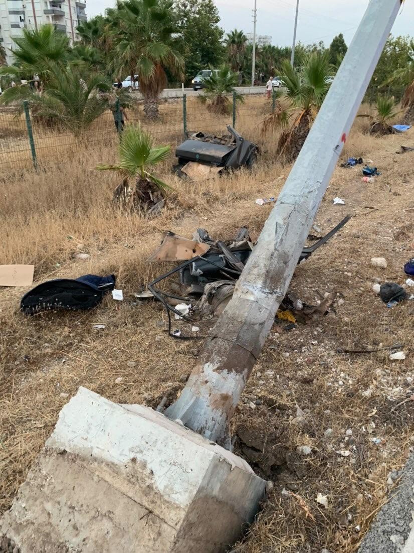 Antalya'da direksiyon hakimiyetini kaybederek refüjde bulunan aydınlatma direğine çarpan otomobil ikiye bölündü.