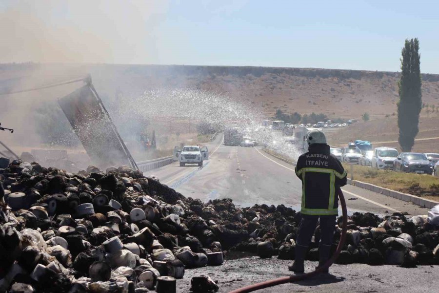 Kayseri'de iplik yüklü tırın kasasında çıkan yangın itfaiye ekipleri tarafından söndürülürken, Kayseri-Ankara Karayolu'nda kilometrelerce araç kuyruğu oluştu.