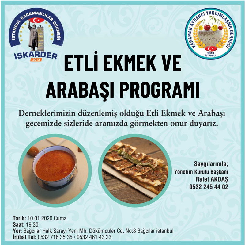 Gecemizde gurbetteki tüm hemşehrilerimiz ile beraber güzel vakit geçirmek ve hasret gidermek için gerekli diğer çalışmaları da yapmaktayız. Gecemizde memleketimizin değerlerini yansıtan etkinliklere ilave olarak yöresel lezzetlerimizden etli ekmek ve akabinde arabaşı ikramımız olacaktır. Bu suretle önceki yaptığımız programlarımıza bir yenisini daha ekleyip Karamanı tanıtmak, hemşerilerimizin bağlarını kuvvetlendirerek pekiştirmek için elimizden gelen gayreti göstermekteyiz.