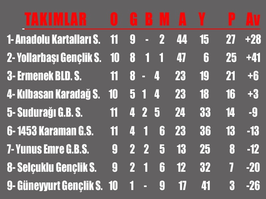Yollarbaşı Spor ise ikinci yarının ilk iki maçında 5 puan birden kaybederek şampiyonluk yolunda ağır yara aldı. Önümüzdeki haftalarda Yollarbaşı spor maç eksiğini avantaja çevirmenin yollarını arayacak. Diğer taraftan taşeli bölgesinin güçlü ekibi Ermenek Belediyespor da liderlik yarışında bende varım diyerek 24 puanla 3cü sırada bulunuyor. Anadolu Kartalları, Yollarbaşı Spor ve Ermenek Belediyespor Amatör ligde şampiyonluk yarışını sürdürüyorlar. Lider Anadolu Kartalları ve Yollarbaşı Spor, Ermenek Belediyespor ile karşılaşacak olması Şampiyonluk yarışının daha sona ermediğini ve önümüzdeki haftalarda Puan tablosunun değişebileceğini gösteriyor.
