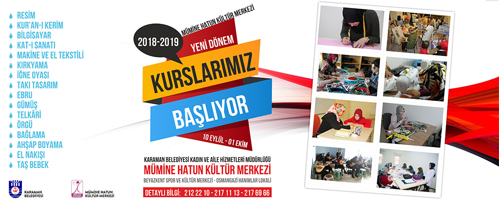 Karaman Belediyesi, Kadın ve Aile Hizmetleri Müdürlüğü bünyesinde faaliyet gösteren Mümine Hatun Kültür Merkezi , Beyazkent Spor ve Kültür Merkezi ve Osmangazi Hanımlar Lokali’nde 2018-2019 dönemi kurs kayıtları başlıyor.