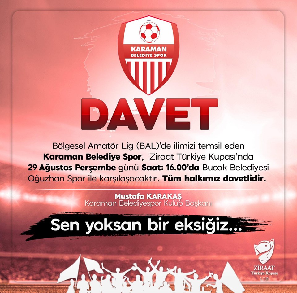 Karaman Belediyespor Kulüp Başkanı Mustafa Karakaş, 29 Ağustos 2019 Perşembe günü saat: 16.00’da oynanacak olan karşılaşmaya takımımızı desteklemek için tüm halkımızı davet etti.