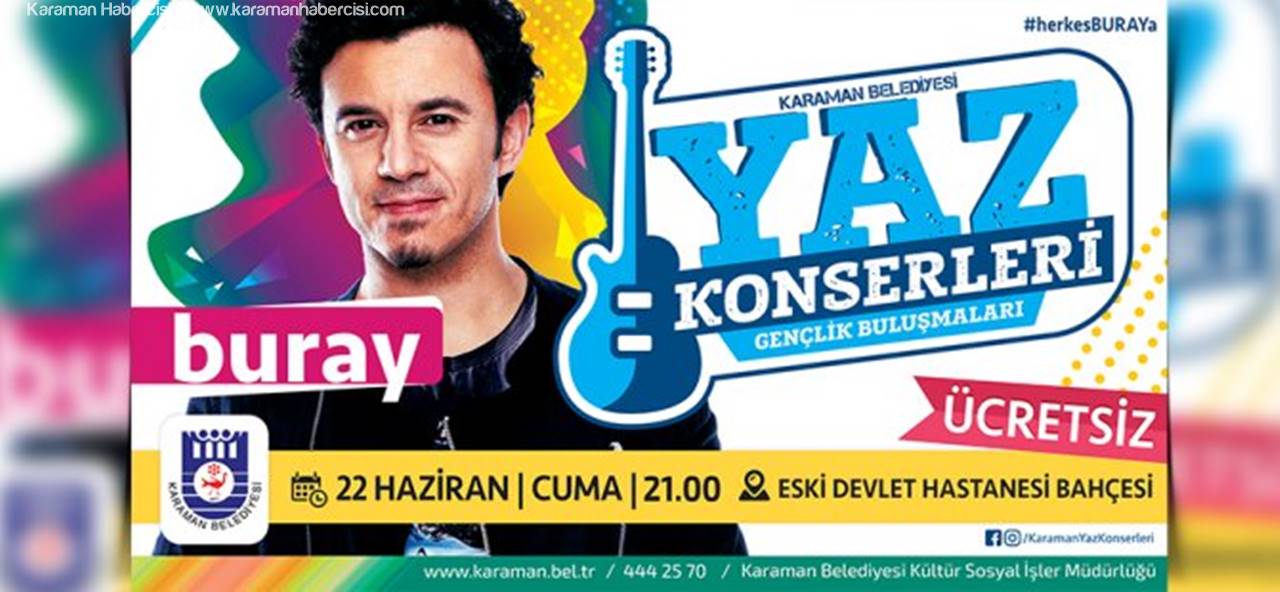 Son dönemde hizmete sunduğu birbirinden önemli projelerle vatandaşların büyük takdirini toplayan Karaman Belediyesi, düzenlediği kültür-sanat etkinlikleri ile de dikkat çekiyor. Bu etkinlikler kapsamında sanatçı Buray 22 Haziran 2018 Cuma akşamı, saat 21.00'da eski devlet hastanesi bahçesinde düzenlenecek olan konserde Karamanlılarla buluşacak.