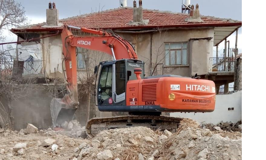 Karaman Belediyesi, şehrin çeşitli yerlerinde bulunan terkedilmiş virane binaları yıkarak bu alandaki çalışmalarını kararlı bir şekilde yürütüyor.