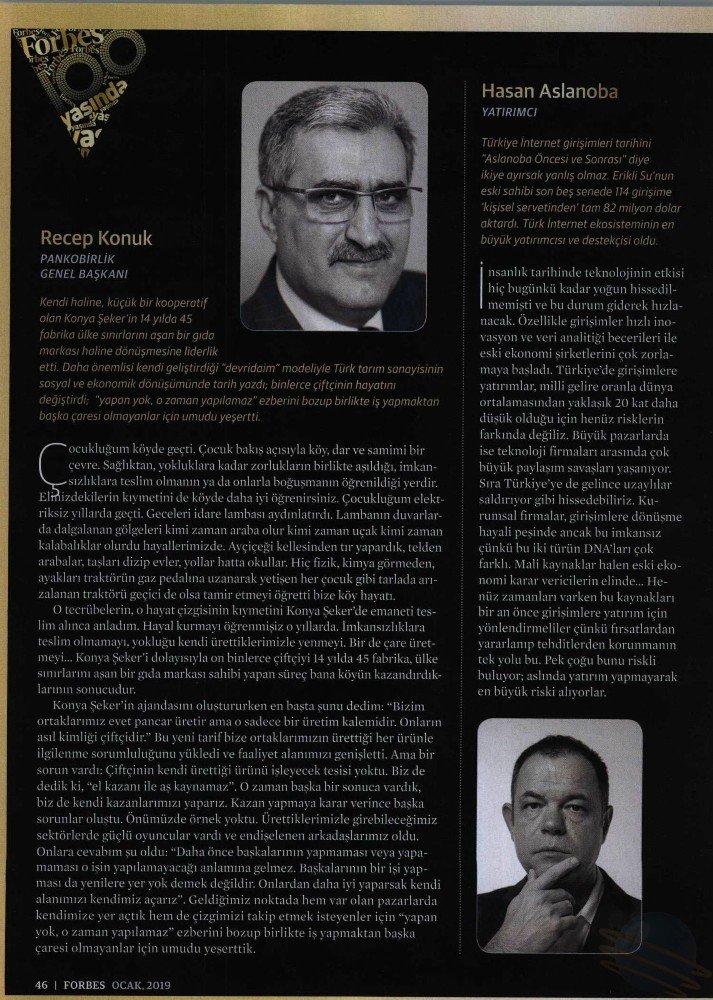 Forbes Dergisi, hazırladığı listede Türkiye'den birçok önemli isme yer verdi. Konya Şeker'i 14 yılda hızla büyüten ve geliştiren Recep Konuk da "Türkiye'nin Yaşayan En Büyük Zihinleri" listesine girdi. Dergi, Konuk hakkında, "Kendi halinde, küçük bir kooperatif olan Konya Şeker'in 14 yılda 45 fabrika ülke sınırlarını aşan bir gıda markası haline dönüşmesine liderlik etti. Daha önemlisi kendi geliştirdiği "devridaim" modeliyle Türk tarım sanayisinin sosyal ve ekonomik dönüşümünde tarih yazdı; binlerce çiftçinin hayatını değiştirdi; "yapan yok, o zaman yapılamaz" ezberini bozup birlikte iş yapmaktan başka çaresi olmayanlar için umudu yeşertti" değerlendirmesini yaptı. Dergi, Recep Konuk'un açıklamalarına da yer verdi.