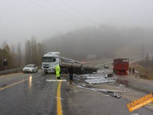 Karaman Mut Yolunda dün meydanda gelen trafik kazasında Mehmet Yeter idaresindeki 42 ERY 68 plakalı çekici kaygan yolda kayarak ters döndü.