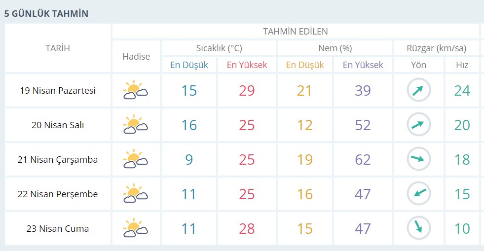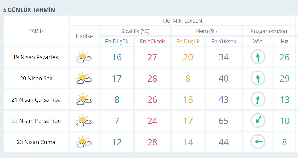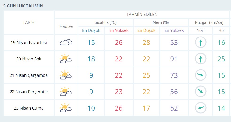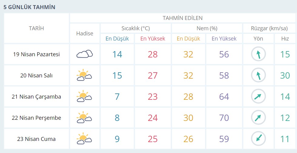 Yapılan son değerlendirmelere göre; Konya merkez, güney ve güneydoğu kesimleri, Aksaray’ın Güzelyurt ve Gülağaç ilçeleri ile Karaman ve Niğde il genelinde rüzgarın; 20.04.2021 Salı sabah saatlerinden itibaren güney (Lodos) yönlerden kuvvetli ve fırtına (40-70 Km/saat), zaman zaman Kuvvetli Fırtına (60-90 Km/saat) şeklinde eseceği tahmin ediliyor. Kuvvetli rüzgar ve fırtınanın 21.04.2021 Çarşamba günü akşam saatlerinden sonra etkisini kaybetmesi bekleniyor.