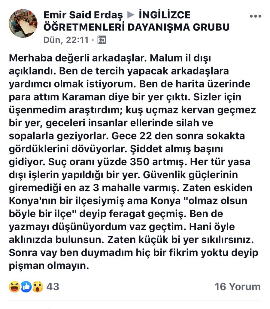 “Merhaba değerli arkadaşlar. Malum il dışı açıklandı. Ben de tercih yapacak arkadaşlara yardımcı olmak istiyorum. Ben de harita üzerinde para attım Karaman diye bir yer çıktı. Sizler için üşenmedim araştırdım; kuş uçmaz kervan geçmez bir yer, geceleri insanlar ellerinde silah ve sopalarla geziyorlar. Gece 22 den sonra sokakta gördüklerini dövüyorlar. Şiddet almış başını gidiyor. Suç oranı yüzde 350 artmış. Her tür yasa dışı işlerin yapıldığı bir yer. Güvenlik güçlerinin giremediği en az 3 mahalle varmış. Zaten eskiden Konya'nın bir ilçesiymiş ama Konya "olmaz olsun böyle bir ilçe" deyip feragat geçmiş. Ben de yazmayı düşünüyordum vaz geçtim. Hani öyle aklınızda bulunsun. Zaten küçük bi yer sıkılırsınız. Sonra vay ben duymadım hiç bir fikrim yoktu deyip pişman olmayın.”
