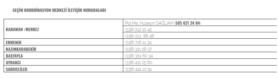 Bu süreçte vatandaşlar tarafından yapılacak olan her türlü ihbar ve şikayetler, aşağıda belirtilen iletişim numaraları üzerinden doğrudan seçim koordinasyon merkezi görevlilerine yapılabilecektir.