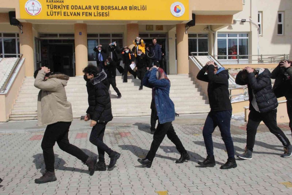 Türkiye Odalar ve Borsalar Birliği Karaman Fen Lisesi'nde gerçekleşen ve il protokolünün de katıldığı tatbikat sonrası jandarma arama kurtarma köpekleri de gösteri yaptı. 1-7 Mart Deprem Haftası kapsamında Türkiye genelinde okullarda eş zamanlı olarak deprem tatbikatı düzenlendi. Tatbikata Karaman Valisi Mehmet Alpaslan Işık, İl Emniyet Müdürü Ayhan Taş, İl Jandarma Komutanı Kıdemli Albay Mustafa Çetinkaya, AFAD İl Müdürü Şerife Han, İl Milli Eğitim Müdürü Mehmet Çalışkan'da katıldı. İlk sirenle sınıfta "çök-kapan-tutun" yöntemini uygulayan öğrenciler, ikinci sirenle birlikte öğretmenlerinin koordinesinde okulun bahçesinde çıkarak boş alanda toplandı. Burada bir konuşma yapan AFAD Karaman İl Müdürü Şerife Han, il genelinde 314 okulda aynı anda tatbikatın gerçekleştirildiğini söyledi.