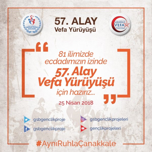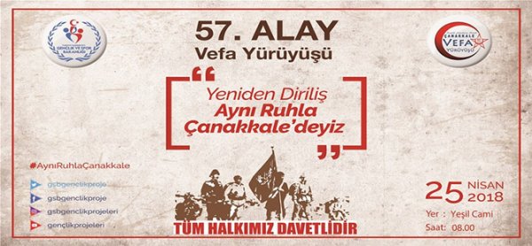 Gençlik ve Spor Bakanlığı’nın Çanakkale Zaferi'nin 103'ncü yılı etkinlikleri kapsamında 81 ilde eş zamanlı olarak düzenlenecek "57. Alaya Vefa Yürüyüşü" Karaman’da Gençlik Hizmetleri ve Spor İl Müdürlüğüne bağlı Gençlik Merkezi tarafından düzenlenecek “57. Alaya Vefa Yürüyüşü” ile anılacak.
