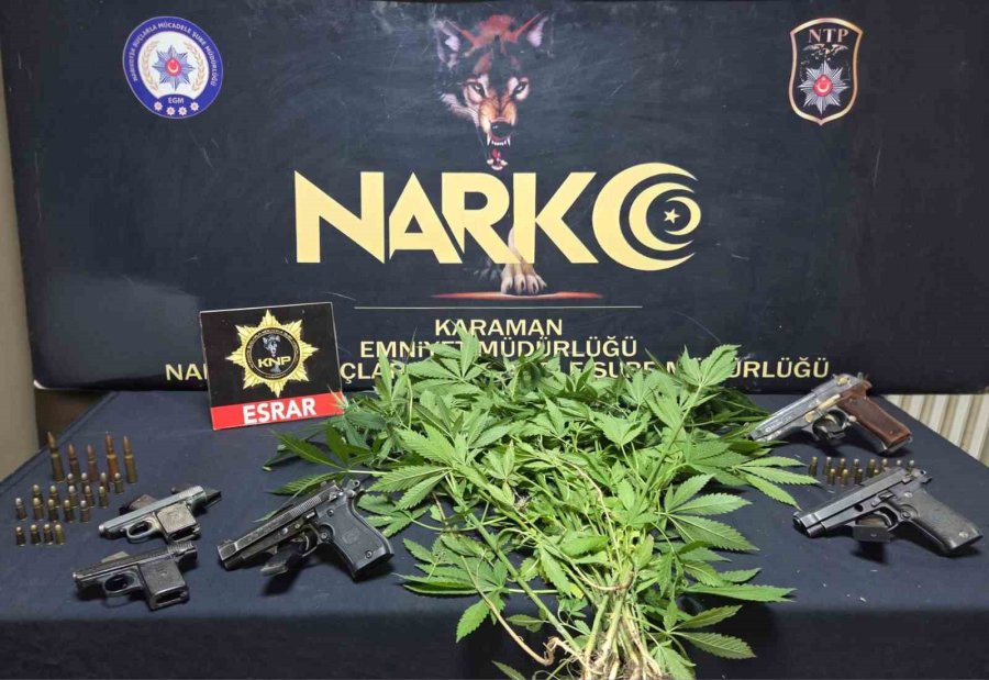 Karaman'da polisin yaptığı asayiş uygulamalarında uyuşturucu ve ruhsatsız silahlar ele geçirilirken, çeşitli suçlardan aranan 10 şahıs tutuklandı.