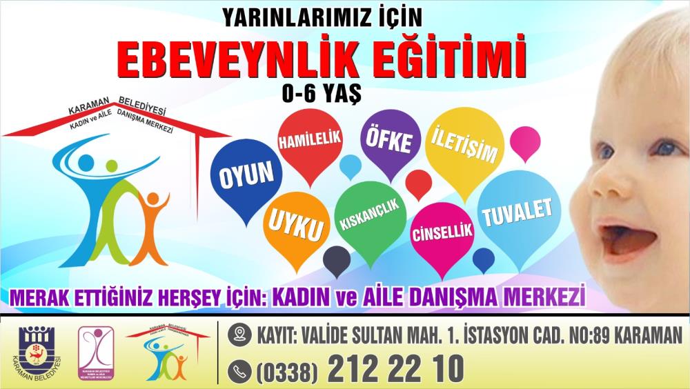 Uzman Psikolog ve Pedagog Sena Saliha Akkoca ile Sosyal Hizmetler Uzmanı ve Aile Danışmanı Esin Karakaş tarafından verilecek olan eğitim kapsamında; “Hamilelik Sürecinde Beni Neler Bekliyor?” “Kardeş Kıskançlığıyla Nasıl Baş edilir?” “Güvenli Bağlanmanın Önemi Nedir?” “Sağlıklı İletişim Nasıl Olmalıdır?” “Postpartum Dönemini En Güzel Nasıl Geçirebilirim?” “Gelişimine Göre Oyun Seçimi Nasıl Olmalı?” “Tuvalet Eğitiminde Nelere Dikkat Etmeliyim?” “Çocukta Duygu Regülasyonu Nasıl Sağlanmalı?” gibi sorulara cevap bulunarak sınırlı kontenjanı olan eğitimden faydalanmak isteyenler; 0 338 212 22 10 numaralı telefondan ya da Valide Sultan Mahallesi 1. İstasyon Caddesi Karaman Lisesi karşısındaki Kadın ve Aile Hizmetleri Müdürlüğünden kayıt yaptırabilirler.