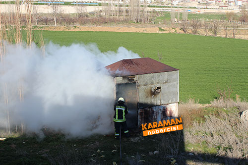 Karaman girişinde bulunan ve ne amaçlı kullanıldığı bilinmeyen yıkık bir yapı yanında bulunan büfe yapısındaki barakada yangın çıktı.