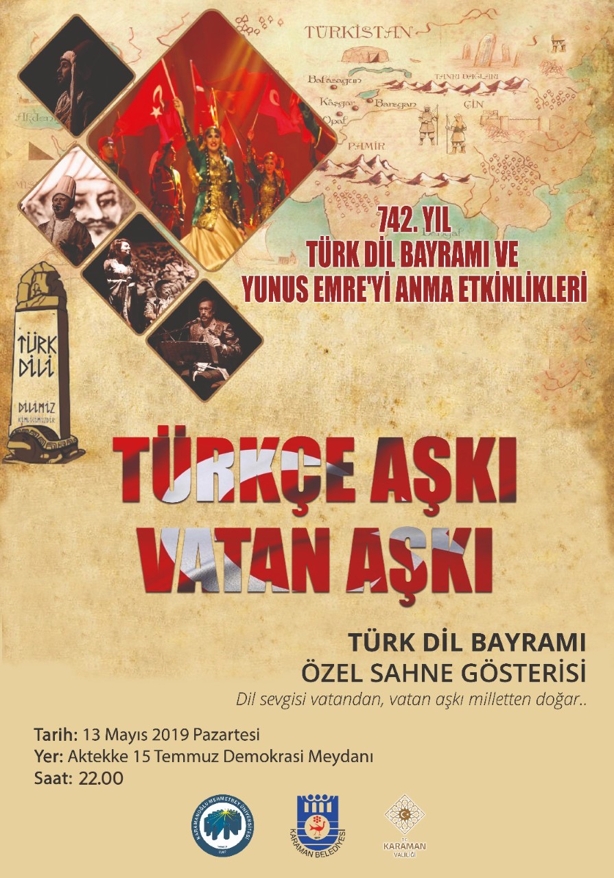 742. Türk Dil Bayramı ve Yunus Emre’yi Anma Etkinlikleri kapsamında, Türkçe Aşkı Vatan Aşkı Özel Sahne gösterisi bu akşam (13 Mayıs Pazartesi) Karamanlılarla buluşacak.