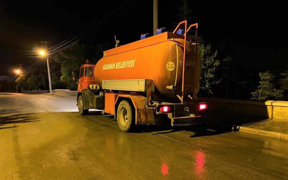 Karaman'da Belediye ekipleri covid-19 salgınına karşı tüm önlem ve tedbirlerini ilk günden itibaren artırarak sürdürüyor. Karaman Belediyesi’nce covid-19 ile mücadele kapsamında kurulan ekip, virüs tehdidini en aza indirmek amacıyla; resmi daireler, okullar, hastaneler, esnaflar, halka açık ortak kullanım alanları, caddeler ve sokaklarda dezenfekte çalışmalarına 7/24 aralıksız bir şekilde devam ediyor.