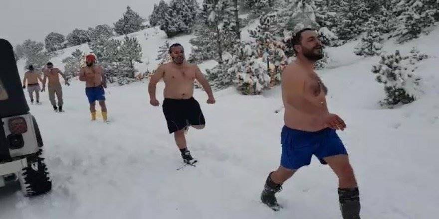 Karaman'da doğa sever beş kafadar, buz gibi havada üzerlerindeki giysileri çıkararak yağan karın keyfini doyasıya çıkardı.