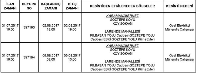 "Karaman 2 İşletmesi sorumluluk alanı içerisinde yer alan aşağıda bilgileri belirtilen bölgelerde yapılacak çalışmalar nedeniyle programlı elektrik kesintisi yapılacaktır.Çalışmaların programlanan süreden erken tamamlanması halinde kesinti bitiş saaatinden önce elektrik verilebilecektir"denildi.Elektrik Kesintisinin yaşanacağı yerler; Kaynak: Karaman'da