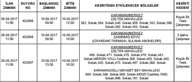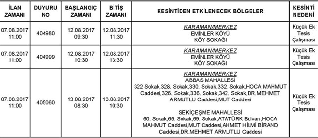 "Karaman 2 İşletmesi sorumluluk alanı içerisinde yer alan aşağıda bilgileri belirtilen bölgelerde yapılacak çalışmalar nedeniyle programlı elektrik kesintisi yapılacaktır.