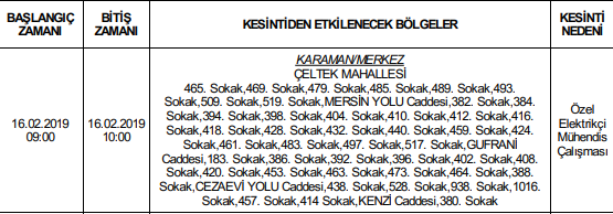 KARAMAN-2 İşletmesi sorumluluk alanı içerisinde yer alan aşağıda bilgileri belirtilen bölgelerde yapılacak çalışmalar nedeniyle programlı elektrik kesintisi yapılacaktır. Çalışmaların programlanan süreden erken tamamlanması halinde kesinti bitiş saatinden önce elektrik verilebilecektir.