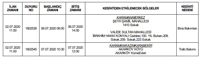 "Karaman 2 İşletmesi sorumluluk alanı içerisinde yer alan aşağıda bilgileri belirtilen bölgelerde yapılacak çalışmalar nedeniyle programlı elektrik kesintisi yapılacaktır.