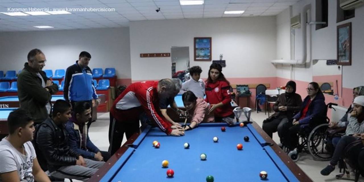 Gençlik ve Spor Bakanlığı’nın dezavantajlı bireyler için 81 ilde Gençlik ve Spor İl Müdürlükleri koordinesinde haftanın her Çarşamba günü başlattığı sportif etkinlikler kapsamında Karaman’da Gençlik ve Spor İl Müdürlüğü tarafından bilardo etkinliği düzenlendi. Atatürk Spor Kompleksi Bilardo Eğitim Merkezi’nde gerçekleşen etkinlikte dezavantajlı bireyler bilardo antrenörü Osman Yılmaz eşliğinde bilardo sporunu tanıma fırsatı buldu. Çoğu dezavantajlı bireyin ilk kez tanıştığı bilardo branşında heyecanları gözlerinden okunurken, bu heyecana Gençlik ve Spor İl Müdürü Ali Osman Bebek ve Şube Müdürleri Mustafa Karadeniz ile Cavit Bardak’ta ortak oldu.
