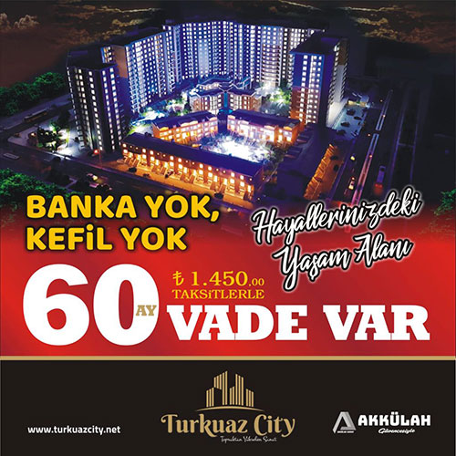 Hayallerinizdeki essiz yaşam alanı Turkuaz City'de 1534TL'den başlayan taksitler,60 aya kadar vadelerle bankasız kefilsiz kira öder gibi kendi evinize sahip olun.