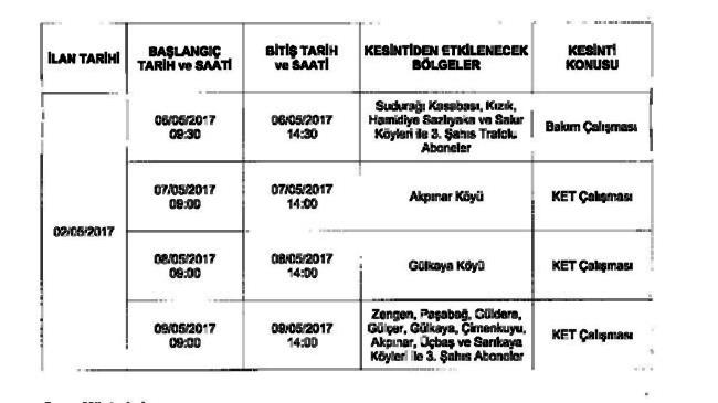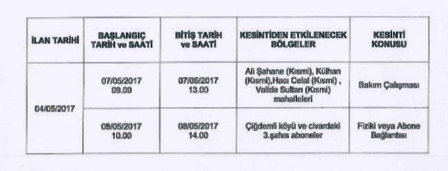 "Karaman 1 İşletmesi sorumluluk alanı içersinde yer alan aşağıda bilgileri belirtilen bölgelerde yapılacak çalışmalar nedeniyle programlı elektrik kesintisi yapılacaktır.Çalışmaların programlanan süreden erken tamamlanması halinde kesinti bitiş saaatinden önce elektrik verilebilecektir"denildi.