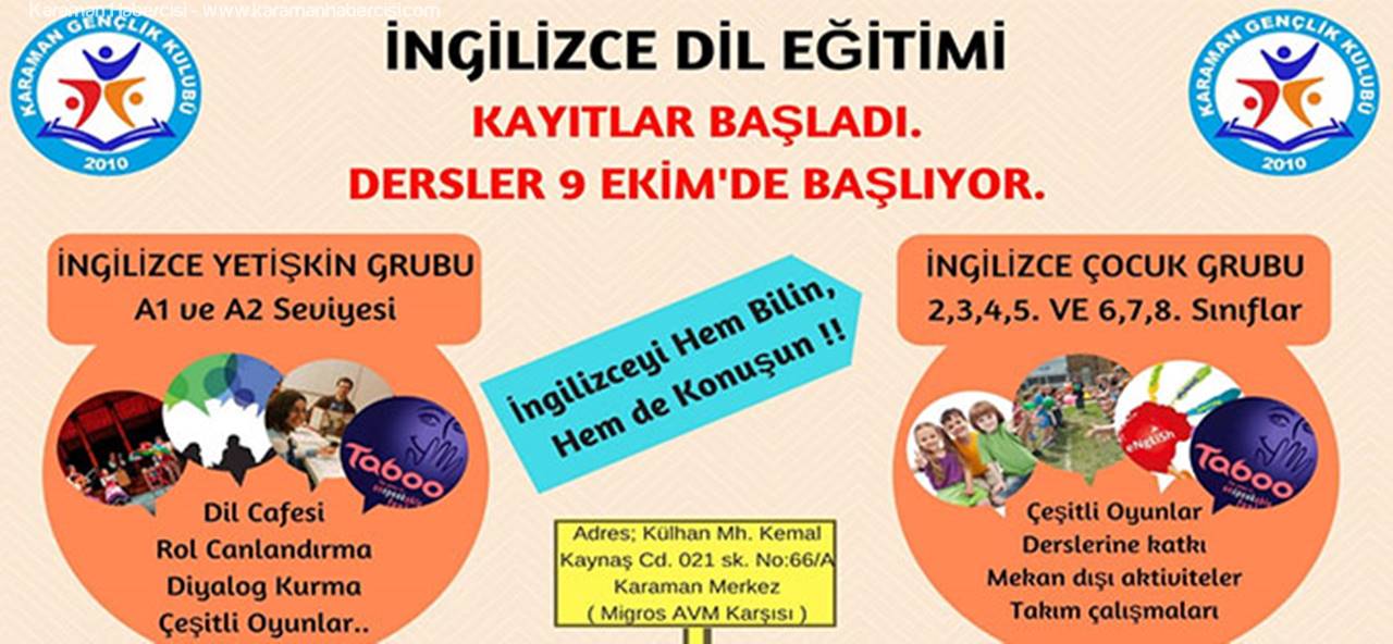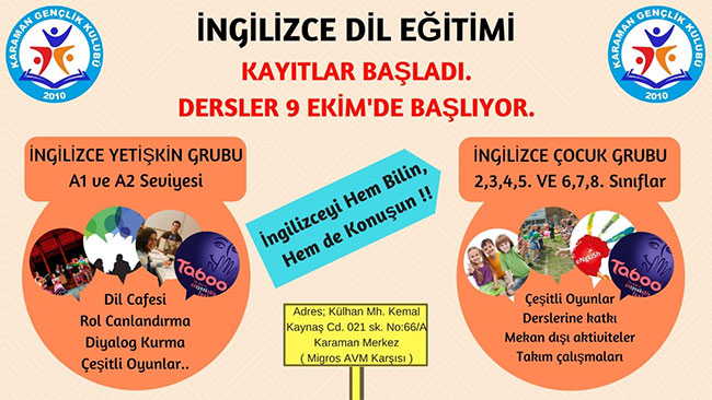 Karaman Gençlik Kulübü Derneği tarafından, 2017-2018 dönemi içerisinde yetişkinlerin, gençlerin ve çocukların boş zamanlarını değerlendirmeleri için İngilizce Dil Eğitim Kursu açılacak.