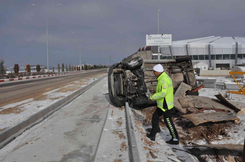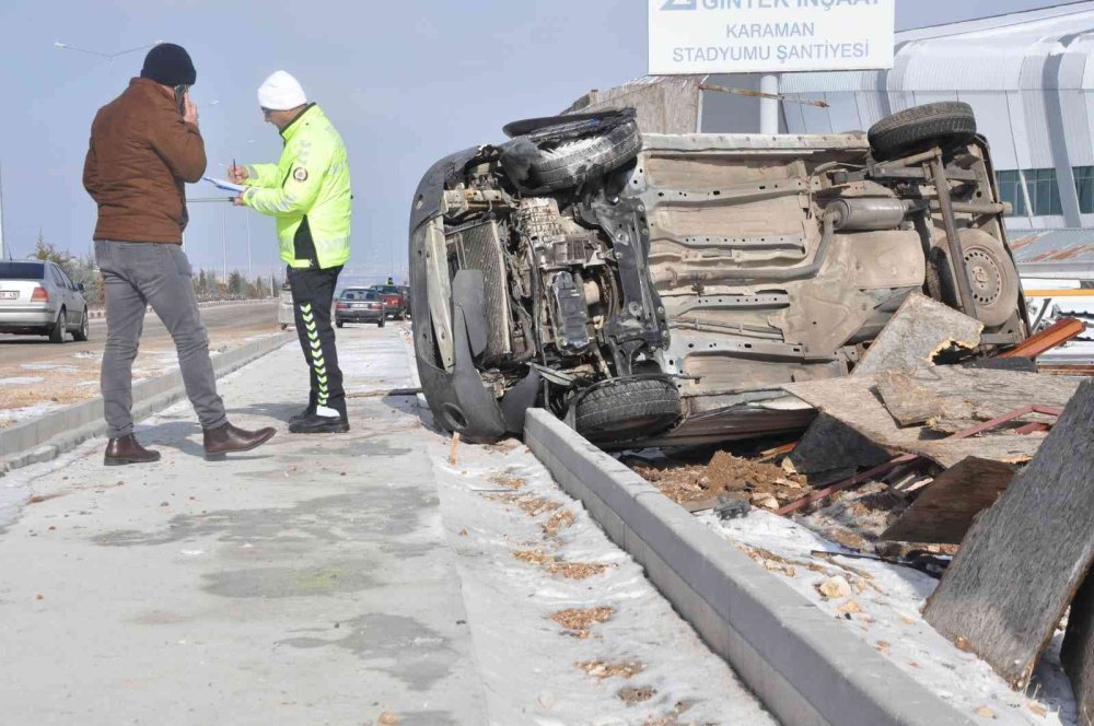 Kar yağışı nedeniyle buzlanan yolda kontrolden çıkan araç, kaldırımı aşarak yeni stadyum inşaatının şantiye bahçesine devrildi. Kazada araçta yolcu olarak bulunan B.Ş. yaralandı. Çevredekilerin haber vermesiyle olay yerine gelen ambulans yaralıyı Karaman Eğitim ve Araştırma Hastanesine kaldırdı. Tedavi altına alınan yaralının sağlık durumunun iyi olduğu öğrenildi.