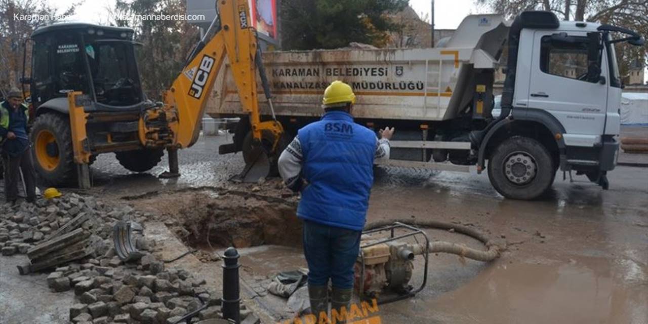 Karaman Belediyesi ekipleri, Külhan Mahallesi İsmet Paşa Caddesi'ndeki su biriken bölgeyi, patlayan su borusunu değiştirmek için iş makinesiyle kazdı.