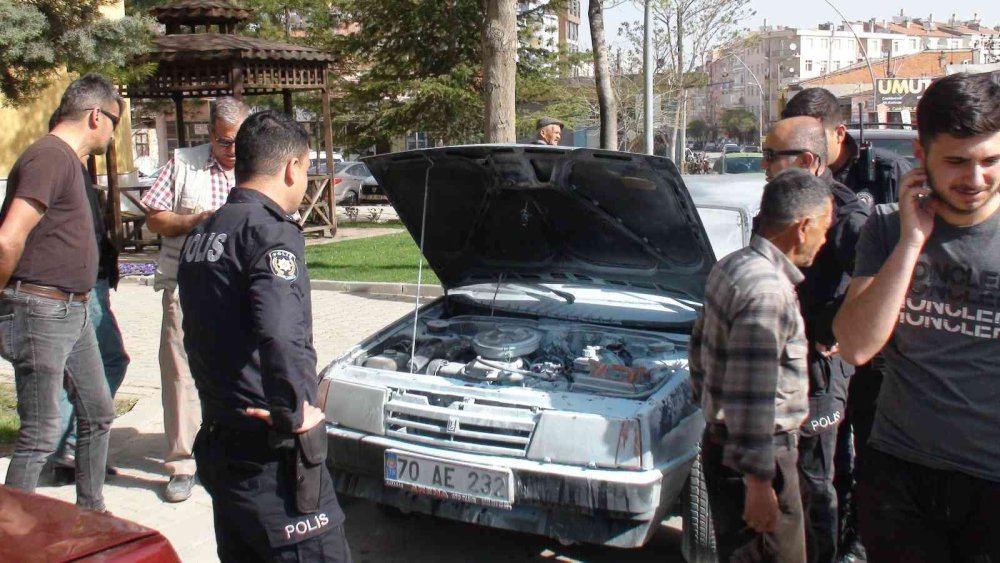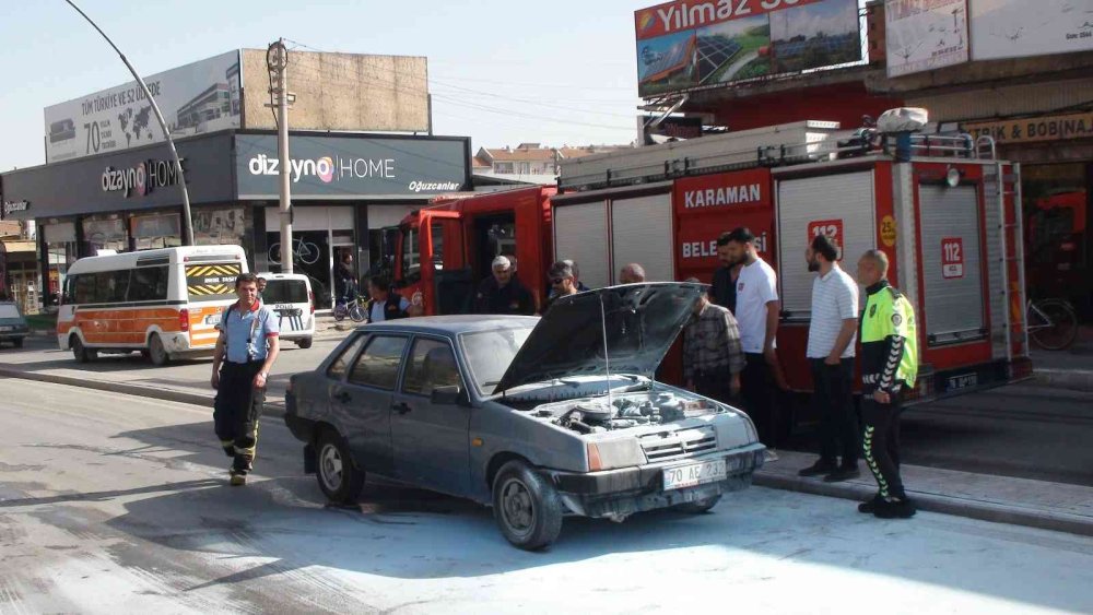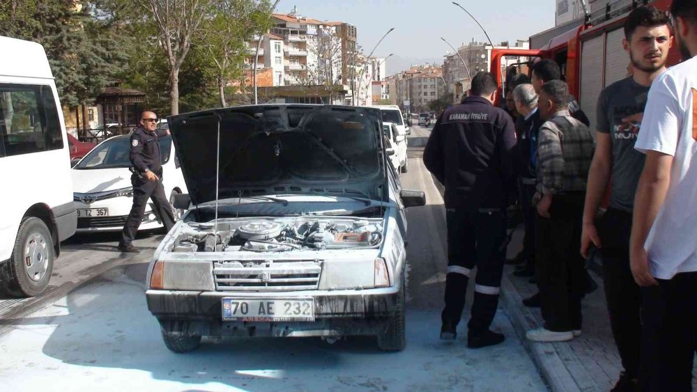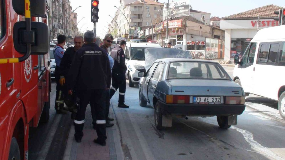 Karaman'da eşi ile birlikte hastaneye giden sürücünün kullandığı otomobil trafik ışıklarında beklerken biranda motor kısmından alev alarak yanmaya başladı. Otomobil, çevredeki vatandaşların yangın tüpüyle müdahale etmesi sonucu yanmaktan kurtarıldı.