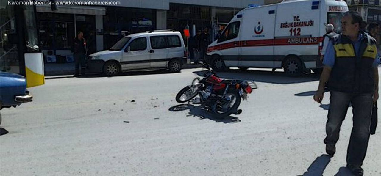 Karaman'da Mut Caddesi, Yunuskent istikametinde gitmekte olan 70 EH 086 plakalı motosiklete 51 DK 645 plakalı otomobil arkadan çarptı.