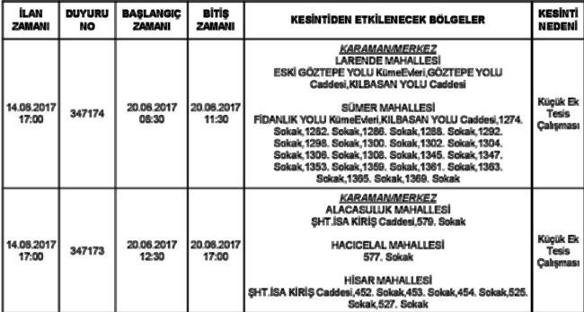 Karaman 2 İşletmesi sorumluluk alanı içersinde yer alan aşağıda bilgileri belirtilen bölgelerde yapılacak çalışmalar nedeniyle programlı elektrik kesintisi yapılacaktır.