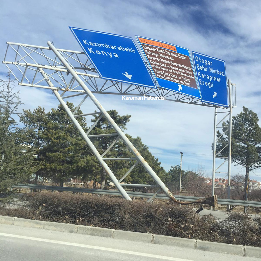 Konya yolunda bir kamyonunda üstündeki yük konteynırının savrulduğu bilgisi alındı. Diğer bir taraftan rüzgarın şiddeti ile Karaman Konya yolunda kaplama üstü bilgi levhalarının da eğilerek arkaya doğru yattığı gözlendi.