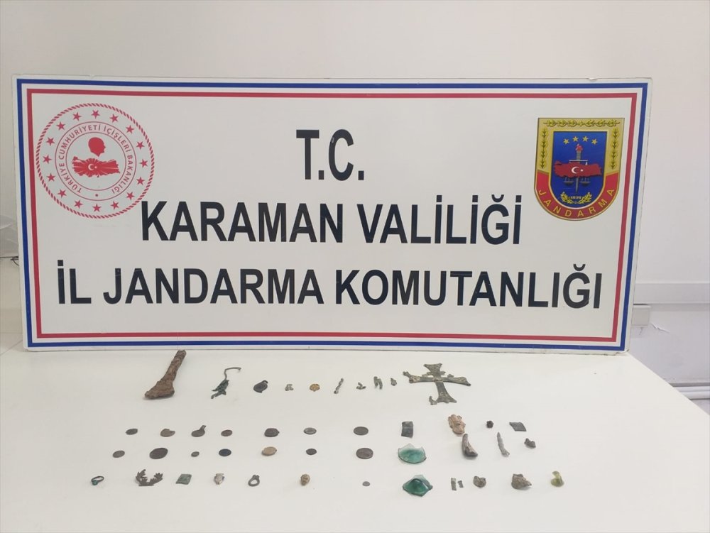 İlçeye bağlı Güneyyurt Beldesinde Jandarma Karakol Komutanlığı ekipleri beldeye bağlı Aralık Mahallesi'nde ikamet eden D.B'nin (42) elinde tarihi eserler olduğu bilgisine ulaştı. Şüpheliyi takibe alan ekipler Ermenek-Güneyyurt kara yolundaki kontrolde şüphelinin kullandığı otomobilde arama yaptı.