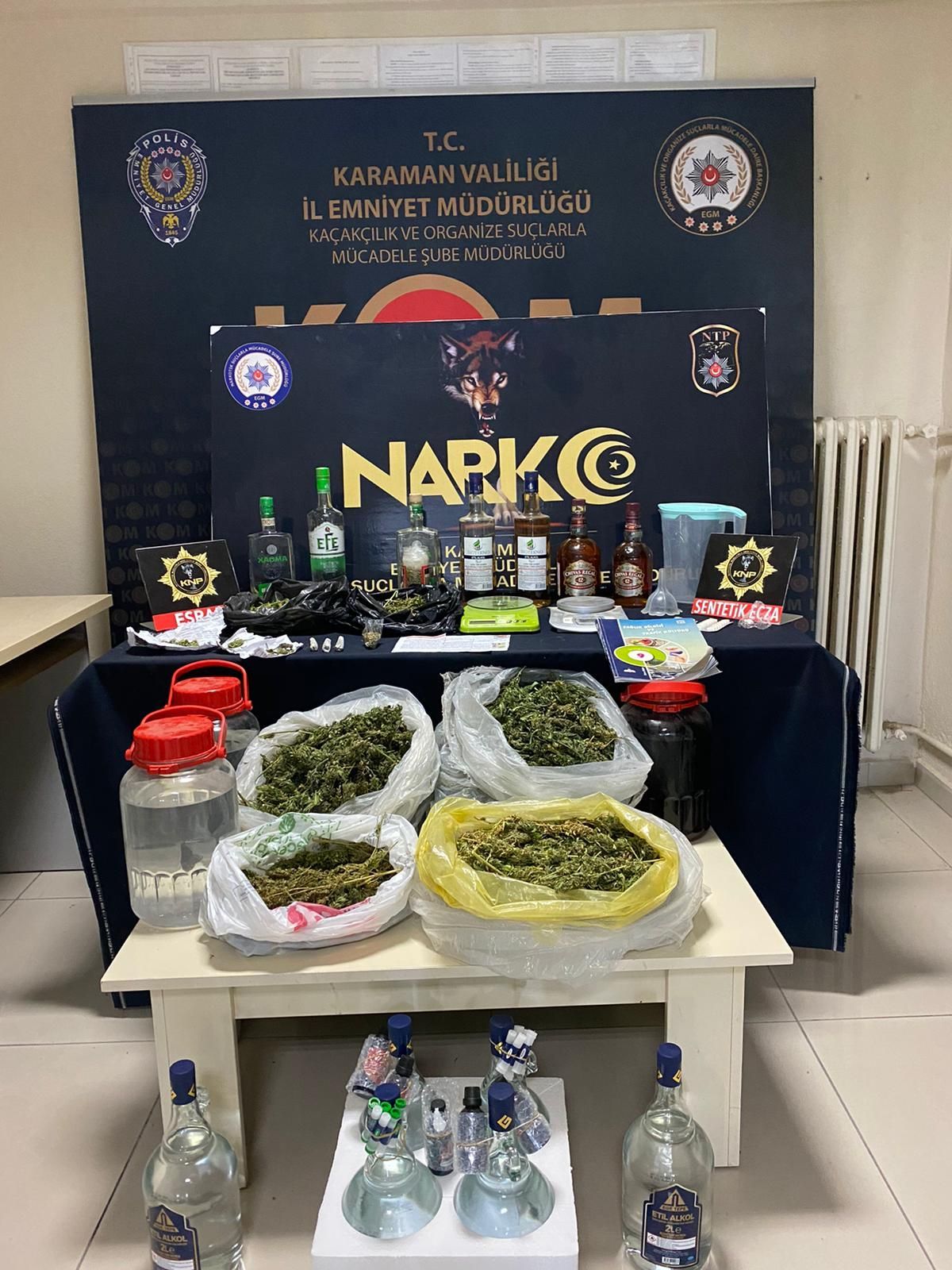 Karaman'da uyuşturucu madde kullanımı ve ticaretinin önlenmesine yönelik olarak 14.10.2020 günü Karaman İl Emniyet Müdürlüğü Narkotik Suçlarla Mücadele Şube Müdürlüğünce yapılan çalışma sonucunda S.L. B.K. ve M.Y. isimli üç şahıs yakalanarak gözaltına alınmıştır.