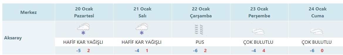 Aksaray; Parçalı ve çok bulutlu, gece ve sabah saatlerinde buzlanma ve don olayı ile birlikte yer yer puslu ve sisli