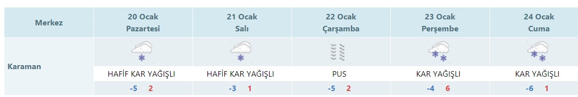 Karaman; Parçalı ve çok bulutlu, gece ve sabah saatlerinde buzlanma ve don olayı ile birlikte yer yer puslu ve sisli