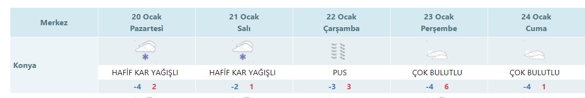 Konya; Parçalı ve çok bulutlu, gece ve sabah saatlerinde buzlanma ve don olayı ile birlikte yer yer puslu ve sisli