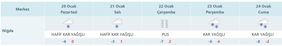 Niğde; Parçalı ve çok bulutlu, gece ve sabah saatlerinde buzlanma ve don olayı ile birlikte yer yer puslu ve sisli