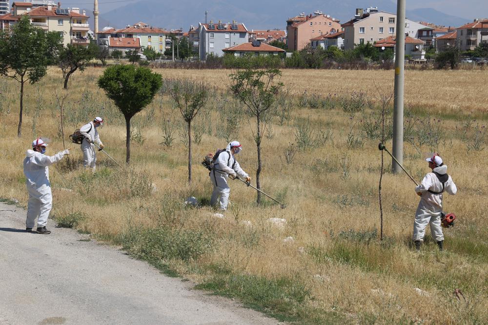 Karaman'da kent genelinde başlatılan çalışmalar ile yol kenarı, kaldırım ve boş arsalarda uzayan yabani otları temizleniyor.