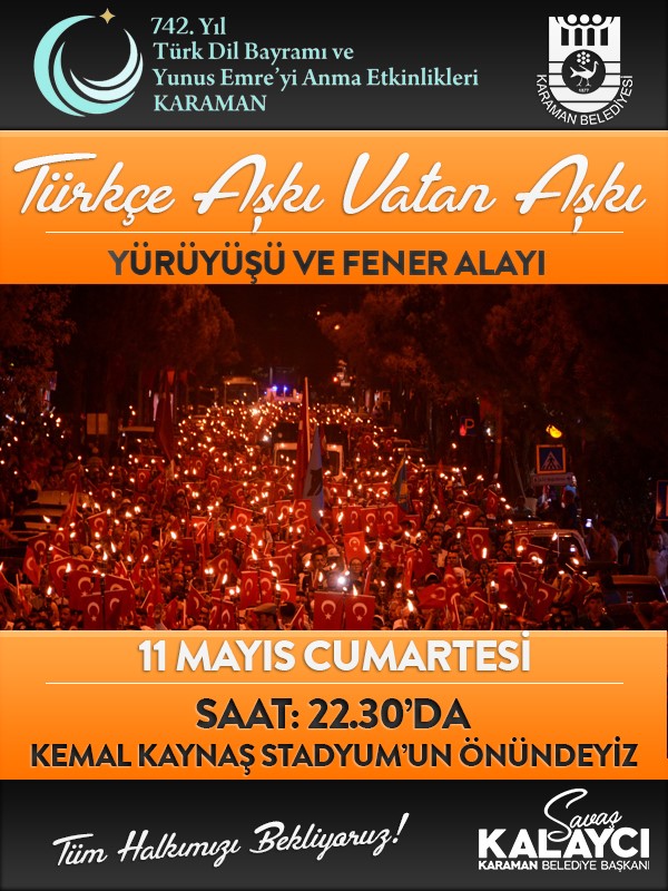 Türk Dil Bayramı ve Yunus Emre’yi anma etkinlikleri devam ediyor. Etkinlikler çerçevesinde yarın (11 Mayıs 2019 Cumartesi) akşam, “Türkçe Aşkı Vatan Aşkı” isimli yürüyüş ve fener alayı düzenlenecek.