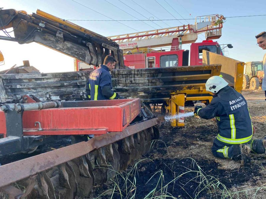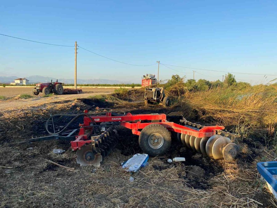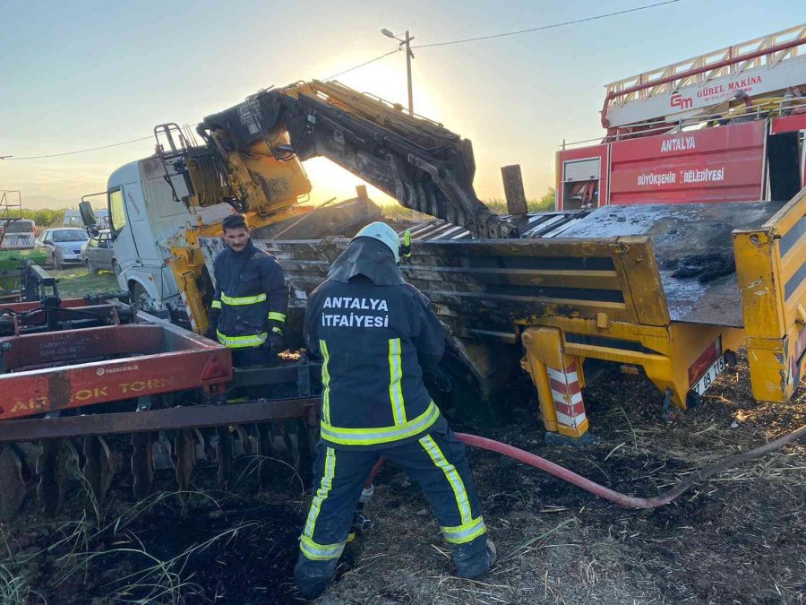 Antalya'nın Serik ilçesinde kargılık alanda çıkan yangında vinç ve tarım aletleri yandı.