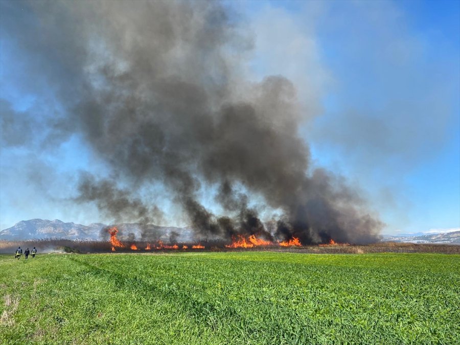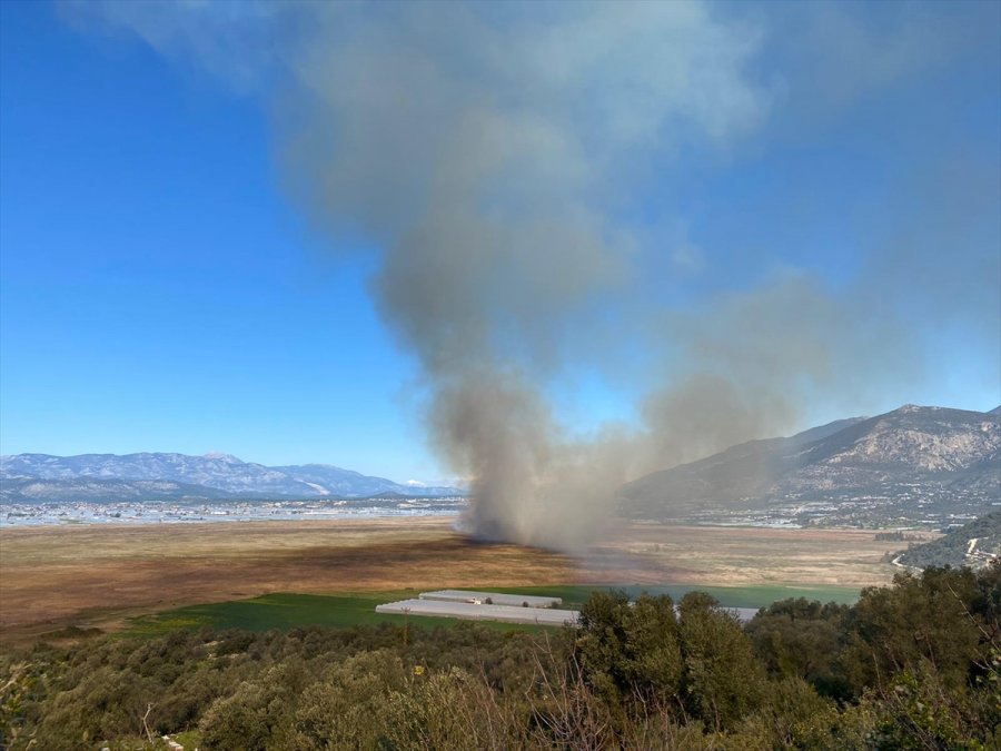 Antalya'nın Kaş ilçesinde sazlık alanda çıkan yangın, seralara sıçramadan kontrol altına alınmaya çalışılıyor.