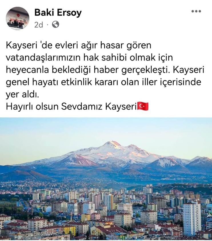 Sosyal medya üzerinden yaptığı paylaşımda Ersoy; "Kayseri'de evleri ağır hasar gören vatandaşlarımızın hak sahibi olmak için heyecanla beklediği haber gerçekleşti. Kayseri genel hayatı etkinlik kararı olan iller içerisinde yer aldı. Hayırlı olsun sevdamız Kayseri" ifadelerini kullandı.