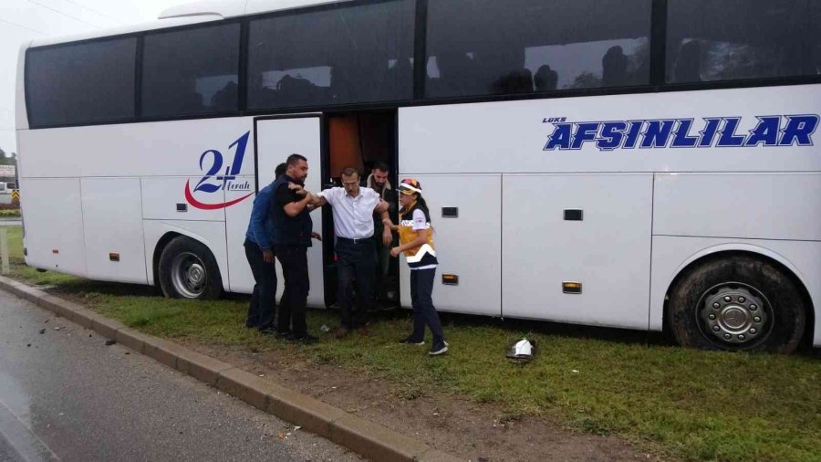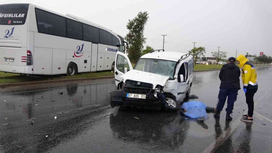 Antalya'nın Manavgat ilçesinde şehirlerarası yolcu otobüsü ile çarpışan otomobilin sürücüsü olay yerinde hayatını kaybetti, eşi ise yaralandı. Acı haberi alan sürücünün yakınları güçlükle sakinleştirildi.