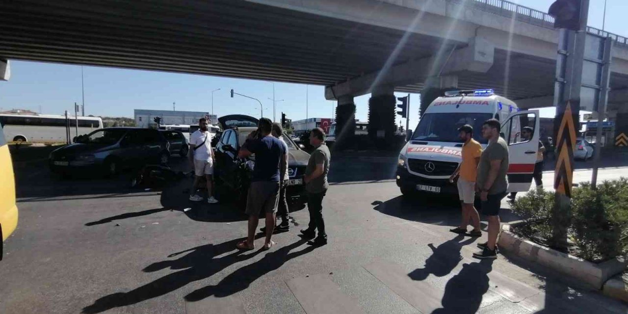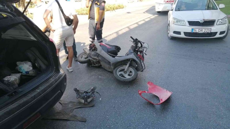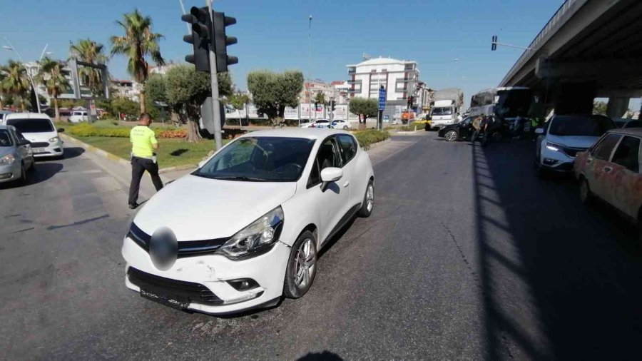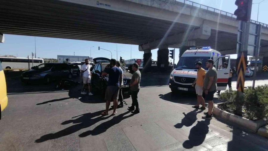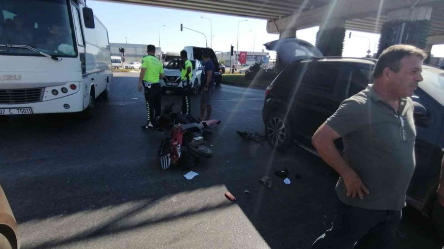 Antalya'nın Manavgat ilçesinde otomobilin çarptığı motosiklet, çarpmanın şiddetiyle yanındaki otomobile çarptı. Otomobilin kırmızı ışık ihlali yapması sonucu meydana geldiği iddia edilen kazada, motosiklet sürücüsü yaralandı.
