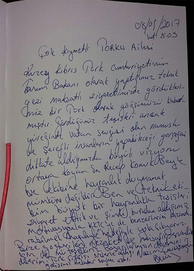 “Çok kıymetli Torku ailesi; Kuzey Kıbrıs Türk Cumhuriyetinin Tarım Bakanı olarak yaptığımız teknik gezi maksatlı ziyaretimizde gördüklerimiz bir Türk olarak göğsümüzü kabartmıştır. Gördüğümüz tesisleri ancak yüreğinde vatan sevgisi olan namuslu ve şerefli insanların yapabileceğini dikkate aldığımızda büyük vizyon ortaya koyan Sayın Recep Konuk ve ekibine hayranlık duymamak mümkün değildir. Ben ve teknik ekibim büyük bir hayranlıkla tesisleri ziyaret ettik ve şimdi buradan aldığımız motivasyonla KKTC’ye de benzerlerini kurabilmek hayaliyle- hedefiyle yola çıkıyoruz. Bize gösterilen nezaket ve misafirperverlik için de müteşekkiriz. Başarılarınızın devamını dilerim. Türk çiftçisi sizlerle aldığı gelişimi ne kadar söylese azdır.”