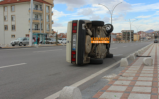 70 EK 187 plakalı otomobil sürücüsünün bir anlık kontrolü kaybetmesi sonucu otomobil kaldırım kenarında bulunan taşa çarparak yol kenarında yan yattı.